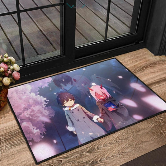 Darling In The Franxx Anime Cute Little Hiro And Red Zero Two Holding Hands Cherry Blossom Door Mat Home Decor