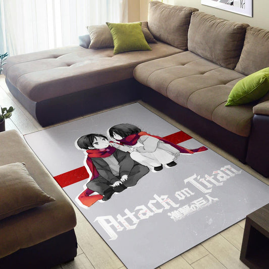 Attack On Titan Anime Area Rug - Chibi Mikasa And Eren Couple Love Wearing Red Scarf Rugs Home Decor
