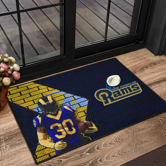 Los Angeles Rams American Football Raymond Calais 30 Holding Rugby Ball Brick Background Door Mat Home Decor