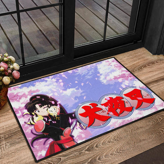 Inuyasha Anime Door Mat Sango And Kirara Hugging Sakura Blossom Kanji Text Door Mat Home Decor