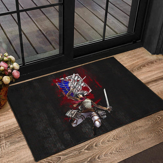 Attack On Titan Anime Door Mat - Mikasa Fighting Bloody Wings Of Freedom Symbol Door Mat Home Decor