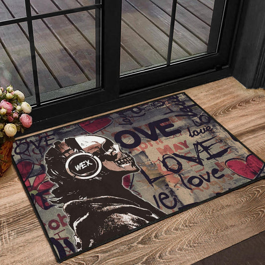 Love Door Mat - Introvert Skeleton Wearing Headphone Love Patterns Door Mat