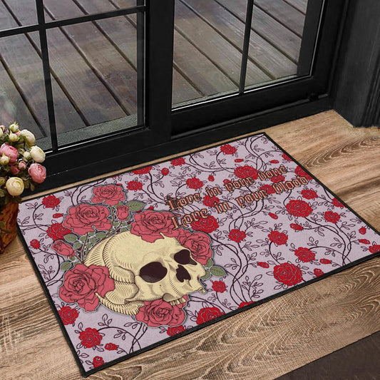Valentine Door Mat - Skulls With Red Roses Flower Love In Bone And Blood Door Mat Home Decor
