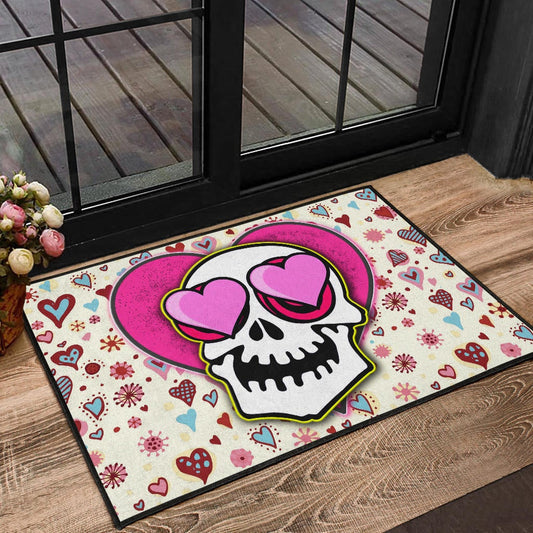 Valentine Door Mat - Skull In Love Heart Eyes Colorful Patterns Door Mat Home Decor