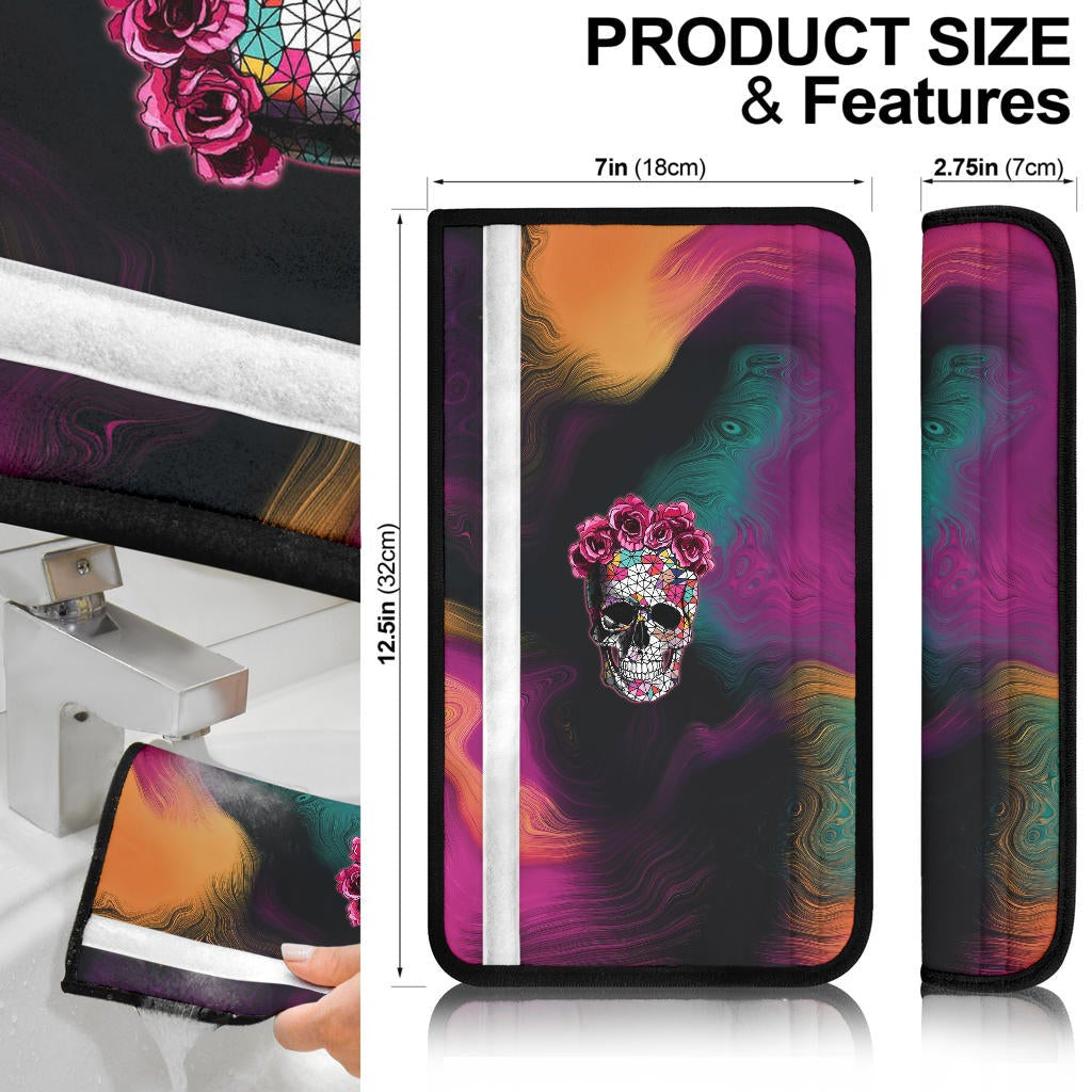 Valentine Seat Belt Covers - Mosaic Skull Wearing Rose Crown Sick Love Belt Covers